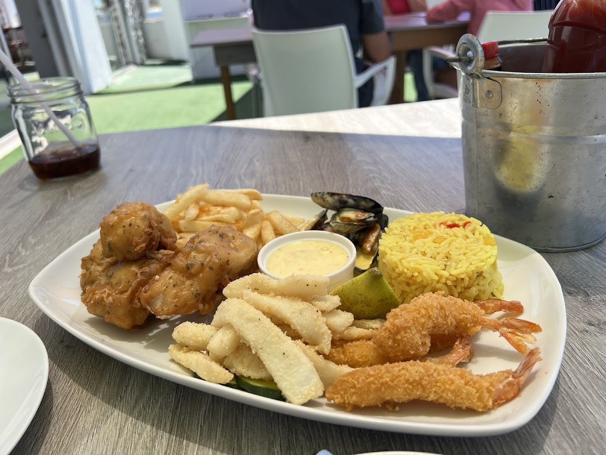 Our waitress, Gemma , suggested that we try the Seafood basket and grilled hake. It was absolutely superb. The hake was ultra fresh & soft with a delicious crispy batter, the prawns done precisely as required , the calamari so soft it nearly melts in your mouth and the mussels sautéed in an amazing creamy sauce and the fries that cannot be beaten. The attached picture says it all.